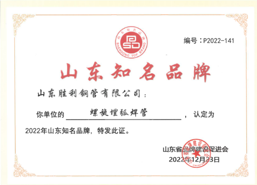 山東勝利螺旋埋弧焊管產(chǎn)品順利通過(guò)2022年度“山東知名品牌”榮譽(yù)認(rèn)證。2022年7月26日認(rèn)證工作啟動(dòng)后,公司積極參加認(rèn)證工作,認(rèn)真組織各項(xiàng)申報(bào)材料,登錄認(rèn)證平臺(tái)提交申報(bào)材料,并承諾確保申報(bào)材料的真實(shí)性、準(zhǔn)確性和有效性?!吧綎|知名品牌”榮譽(yù)的獲得,將大大有助于公司螺旋埋弧焊管進(jìn)一步拓寬省內(nèi)外銷(xiāo)售市場(chǎng),有助于爭(zhēng)取更多的社會(huì)市場(chǎng)訂單。