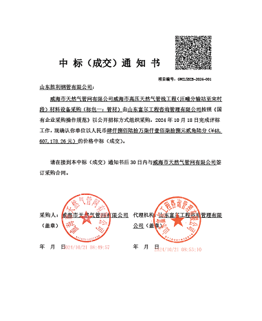 ??近日,山東勝利成功中標了威海市高壓天然氣管線工程(汪疃分輸站至宋村段)材料設備采購的項目,該項目總量8000余噸,標志著公司在市場競爭中再次取得了顯著成果,實力得到了市場的廣泛認可。